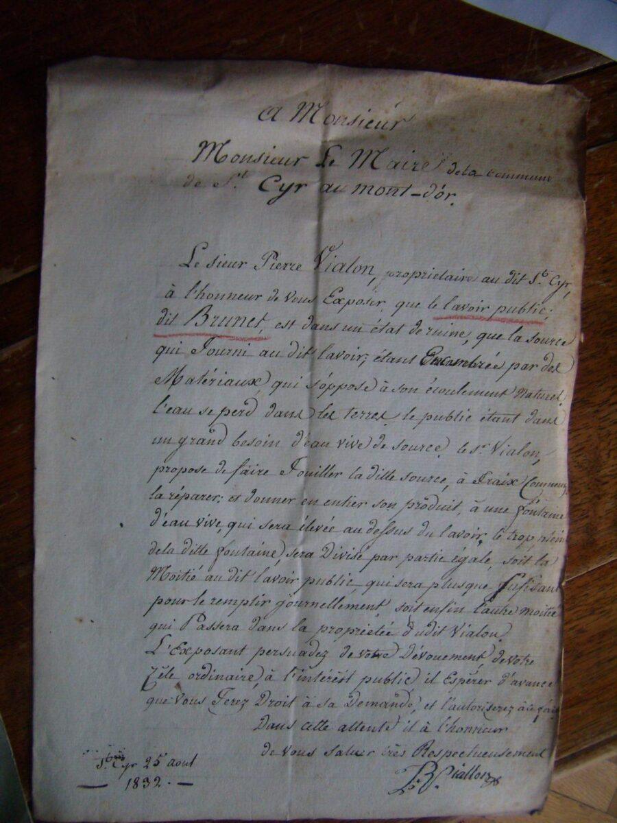 Le 25 Août 1832, Pierre Viallon*, propriétaire chemin de Borney, demande l’autorisation à la commune d’exécuter des travaux sur »’le lavoir public « dit Brunet » »’ « qui est dans un état de ruine, que la source qui fournit audit lavoir étant encombrée par des matériaux qui s’opposent à son écoulement naturel, l’eau se perd dans les terres; le public étant dans un grand besoin d’eau vive de source, le sieur Viallon propose de faire fouiller ladite source, à frais communs la réparer, et donner en entier son produit à une fontaine d’eau vive qui sera élevée au-dessus du lavoir. Le trop-plein de ladite fontaine sera divisé par parties égales, soit la moitié audit lavoir public qui sera plus que suffisant pour le remplir journellement; soit enfin l’autre moitié qui passera dans la propriété dudit Viallon… »