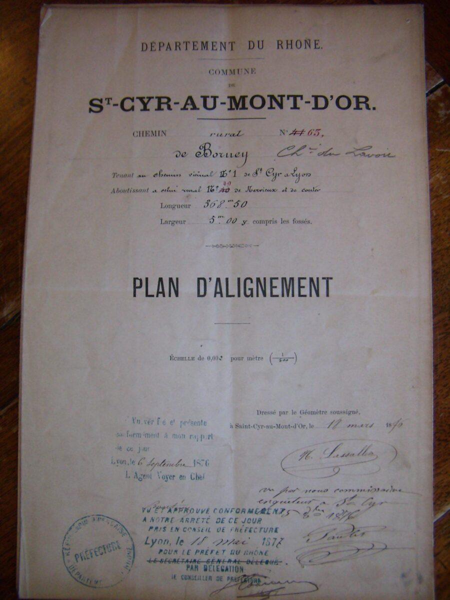 En 1882, la veuve d’André Viallon demande l’autorisation de reconstruire un mur de clôture sur le chemin rural n°63 de Borney, vu le plan d’alignement légalement approuvé le 18 Mai 1877.